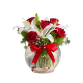 Avrupalı Sevgili Cam Vazo İçerisinde Beyaz Lilyum ve Kırmızı Gül Aranjmanı